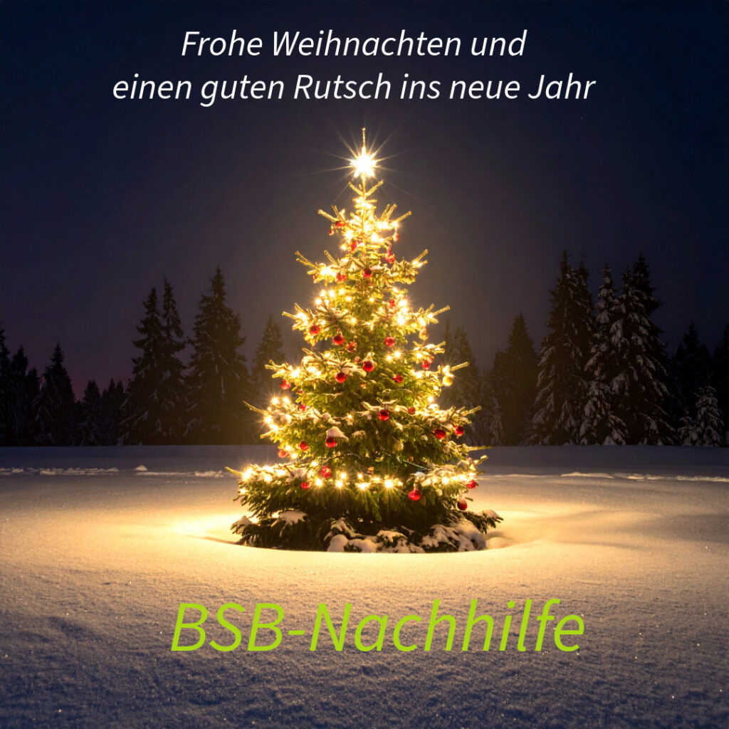 | Liebe Eltern, liebe Schüler, wegen der Weihnachtsferien bleibt unser Institut vom 20.12.2025-07.01.2026 geschlossen. Ab dem 8.1.2026 findet der Unterricht wieder wie gewohnt statt. In den Ferien sind wir wie gewohnt erreichbar unter 02742/967511 Wir wünschen allen unseren Schülern und deren Familien schöne Weihnachtsferien. Ihr BSB-Team |